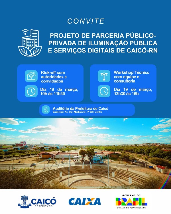 A Prefeitura de Caicó (RN) realiza, nesta quinta-feira, 19 de março, o lançamento do projeto de Parceria Público-Privada (PPP) que irá promover a modernização da iluminação pública do município e estruturar uma nova base tecnológica voltada à